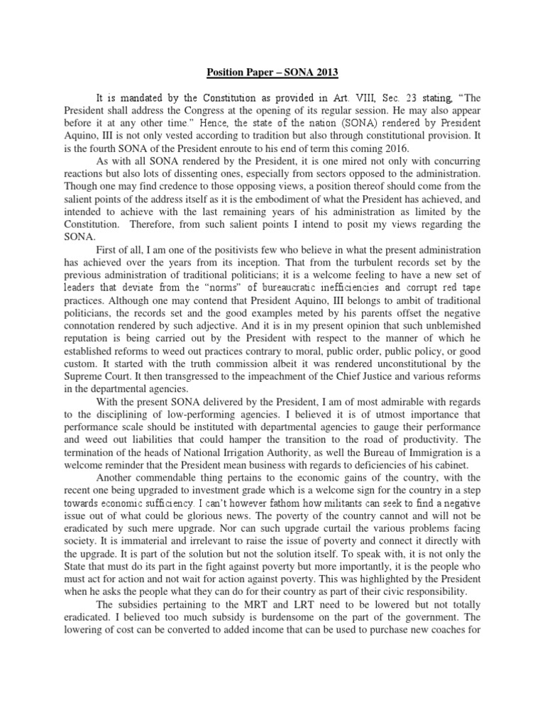 Writing a position paper is outlining your stand on a particular issue being discussed in a certain conference or meeting. Do you mean you are writing for or against this. The position paper is literally your bible throughout the conference. The philippine poverty rate decreased from 233% in 2015 to 167% in 2018, and is expected to decline further in the following years example of position paper. The position papers submitted here are formal, public statements of a delegation's position on the topics under consideration in a particular committee.